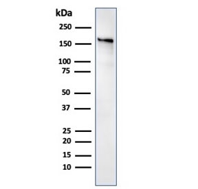 Western blot testing of human kidney lysate with ACE antibody. Expected molecular weight 140-170+ kDa depending on glycosylation level.