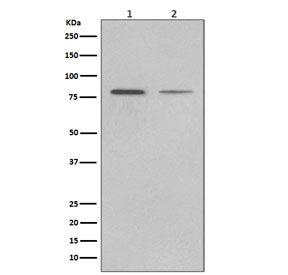 Western blot testing of human 1) LNCaP and 2) HepG2 cell lysate with BiP antibody. Predicted molecular weight: ~73 kDa, but routinely observed at 70-78 kDa.