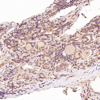 IHC staining of FFPE human thyroid cancer tissue with BiP antibody. HIER: boil tissue sections in pH6, 10mM citrate buffer, for 10-20 min followed by cooling at RT for 20 min.