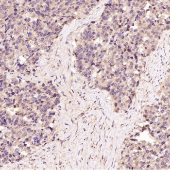 IHC staining of FFPE human pancreas tissue with BiP antibody. HIER: boil tissue sections in pH6, 10mM citrate buffer, for 10-20 min followed by cooling at RT for 20 min.