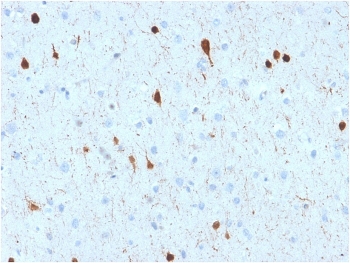 It recognizes a protein of about 29kDa, which is identified as Calretinin (also known as Calbindin 2). Calretinin is a vitamin D-dependent calcium-binding protein involved in calcium signaling. It is present in subsets of neurons throughout the brain and spinal chord, including sensory ganglia. Antibody to calretinin is useful in differentiating mesothelioma from adenocarcinomas of the lung. It also aids in differentiating adrenal cortical neoplasms from pheochromocytomas.