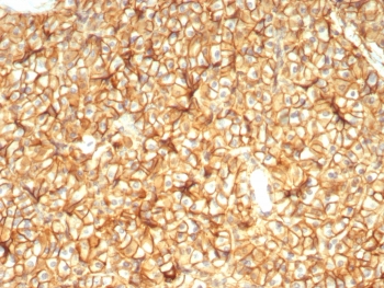 Recognizes a sialoglycoprotein of 27-32kDa, identified as CD99, or MIC2 gene product, or E2 antigen. MIC2 gene is located in the pseudo-autosomal region of the human X and Y chromosome. MIC2 gene encodes two distinct proteins, which are produced by alternative splicing of the CD99 gene transcript and are identified as bands of 30 and 32kDa (p30/32). Although its function is not fully understood, CD99 is implicated in various cellular processes including homotypic aggregation of T cells, upregulation of T cell receptor and MHS molecules, apoptosis of immature thymocytes and leukocyte diapedesis. CD99 is expressed on the cell membrane of some lymphocytes, cortical thymocytes, and granulosa cells of the ovary. Most pancreatic islet cells, Sertoli cells of the testis, and some endothelial cells express this antigen. Mature granulocytes express very little or no CD99. MIC2 is strongly expressed on Ewing s sarcoma cells and primitive peripheral neuroectodermal tumors.