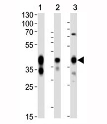 Western blot analysis of mouse 1) kidney, 2) lung and 3) testis lysate using Epcam antibody