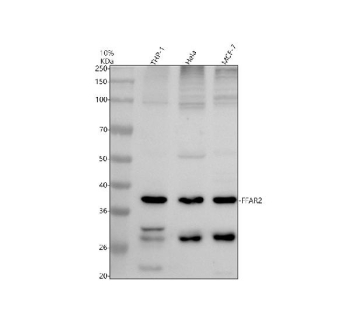 Functionally, Free fatty acid receptor 2 couples to intracellular G proteins to regulate downstream pathways that influence cytokine production, chemotaxis, and cellular activation. Through these signaling cascades, FFAR2 contributes to immune homeostasis and modulation of inflammatory responses. The receptor also plays a role in metabolic regulation by influencing energy balance and insulin sensitivity, reflecting its broader involvement in host physiology. An FFAR2 antibody is useful for examining receptor expression patterns and signaling-related changes in diverse experimental systems.