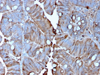 IHC staining of FFPE human colon carcinoma with MerTK antibody (clone MERTK/3015). HIER: boil tissue sections in pH 9 10mM Tris with 1mM EDTA for 10-20 min and allow to cool before testing.