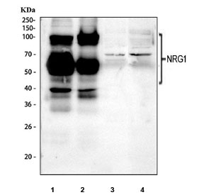 An amino acid sequence from the C-terminus of human Neuregulin 1 (RFSTQEEIQARLSSVIANQD) was used as the immunogen for this NRG1 antibody.