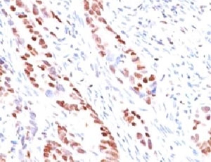 Recognizes a protein of 57kDa, identified as p57Kip2. It shows no cross-reaction with p27Kip1. p57Kip2 is a potent tight-binding inhibitor of several G1 cyclin complexes, and is a negative regulator of cell proliferation. Anti-p57 has been used as an aide in identification of complete hydatidiform mole (CHM) (no nuclear labeling of cytotrophoblasts and stromal cells) from partial hydatidiform mole (PHM) in which both cytotrophoblasts and stromal cells stain. The histological differentiation of complete mole, partial mole, and hydropic spontaneous abortion is problematic. Most complete hydatidiform moles are diploid, whereas most partial moles are triploid. Ploidy studies will identify partial moles, but will not differentiate complete moles from non-molar gestations. Complete moles carry a high risk of persistent disease and choriocarcinoma, while partial moles have a very low risk. In normal placenta, many cytotrophoblast nuclei and stromal cells are labeled with this antibody. Similar findings apply to PHM and hydropic abortus tissues. Intervillous trophoblastic islands (IVTIs) demonstrate nuclear labeling in all three entities and serve as an internal control.