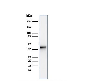 This antibody recognizes a protein of 42kDa, which is identified as AMACR, also known as p504S. It is an enzyme that is involved in bile acid biosynthesis and b-oxidation of branched-chain fatty acids. AMACR is essential in lipid metabolism. It is expressed in cells of premalignant high-grade prostatic intraepithelial neoplasia (HGPIN) and prostate adenocarcinoma. The majority of the carcinoma cells show a distinct granular cytoplasmic staining reaction. AMACR is present at low or undetectable levels in glandular epithelial cells of normal prostate and benign prostatic hyperplasia. A spotty granular cytoplasmic staining is seen in a few cells of the benign glands. AMACR is expressed in normal liver (hepatocytes), kidney (tubular epithelial cells) and gall bladder (epithelial cells). Expression has also been found in lung (bronchial epithelial cells) and colon (colonic surface epithelium). AMACR expression can also be found in hepatocellular carcinoma and kidney carcinoma. Past studies have also shown that AMACR is expressed in various colon carcinomas (well, moderately and poorly differentiated) and over expressed in prostate carcinoma.