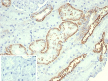 This mAb recognizes a protein of 130kDa, identified as Ksp-cadherin. Cadherins form a superfamily of related glycoproteins that mediate calcium-dependent cell adhesion and transmit signals from the extracellular matrix to the cytoplasm. Cadherins have been implicated in embryogenesis, tissue morphogenesis, tissue structure maintenance, cell polarization, neoplastic invasiveness and metastasis, and membrane transport. It is suggested that Ksp-cadherin is a marker for terminal differentiation of the basolateral membranes of renal tubular epithelial cells. Within the kidney, Ksp-Cadherin is found exclusively in the basolateral membrane of renal tubular epithelial cells and collecting duct cells, and not in glomeruli, renal interstitial cells, or blood vessels.Ksp-Cadherin has been suggested to distinguish Chromophobe Renal-Cell Carcinoma from Oncocytoma.