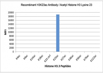 This recombinant H3K23ac antibody reacts to Histone H3 acetylated at Lysine 23 (K23ac). No cross reactivity with other acetylated Lysines in Histone H3.