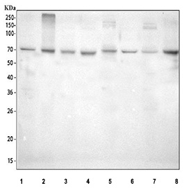 Functionally, SHP-2 antibody identifies a 593-amino-acid enzyme that mediates dephosphorylation of specific phosphotyrosine residues, facilitating activation of the RAS-MAPK signaling cascade. In its inactive state, the N-terminal SH2 domain blocks the catalytic site, maintaining SHP-2 in an autoinhibited conformation. Upon binding to phosphorylated adaptor proteins such as GAB1, SHC, or IRS1, the enzyme undergoes a conformational change that exposes its active site, enabling precise regulation of cell growth, differentiation, migration, and survival. This mechanism positions SHP-2 as an essential mediator of receptor tyrosine kinase signaling and developmental pathways.