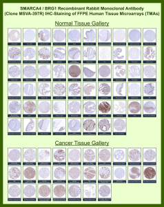 A recombinant fragment (around amino acids 200-400) of human SMARCA4 protein (exact sequence is proprietary) was used as the immuongen for the SMARCA4/SWI/SNF related matrix associated actin dependent regulator of chromatin subfamily A member 4 antibody.