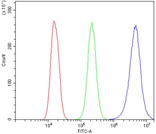 Flow cytometry testing of human A549 cells with TRIM28 antibody at 1ug/million cells (blocked with goat sera); Red=cells alone, Green=isotype control, Blue= TRIM28 antibody.