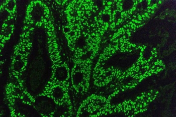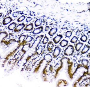 IHC staining of FFPE mouse small intestine with TRIM28 antibody. HIER: boil tissue sections in pH8 EDTA for 20 min and allow to cool before testing.