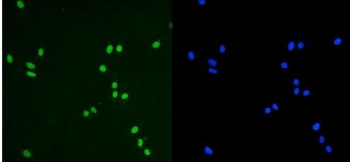 Immunofluorescent staining of FFPE human U-2 OS cells with TRIM28 antibody (green) and DAPI nuclear stain (blue). HIER: steam section in pH6 citrate buffer for 20 min.