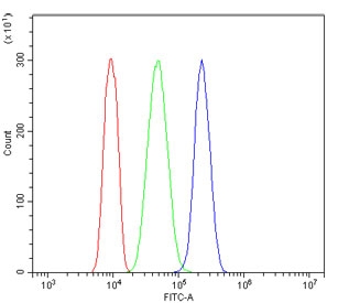 Flow cytometry testing of human HL-60 cells with TXN2 antibody at 1ug/million cells (blocked with goat sera); Red=cells alone, Green=isotype control, Blue= TXN2 antibody.