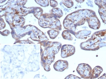 IHC staining of FFPE human placental tissue with VEGF antibody (clone VEGFA/7636R). Inset: PBS used in place of primary Ab (secondary Ab negative control). HIER: boil tissue sections in pH 9 10mM Tris with 1mM EDTA for 20 min and allow to cool before testing.