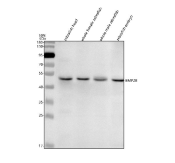 E. coli-derived zebrafish Bmp2b recombinant protein (amino acids E27-D279) was used as the immunogen for the Zebrafish Bmp2b antibody.