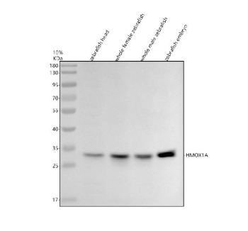 E. coli-derived zebrafish Hmox1a recombinant protein (amino acids M1-K244) was used as the immunogen for the Zebrafish Hmox1a antibody.